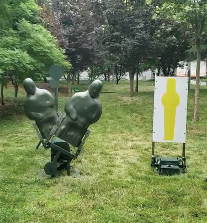 雙向搖擺靶機(jī)集成機(jī)械搖擺靶、劫匪靶、自動報靶類產(chǎn)品功能,參考其它國家反恐訓(xùn)練裝備器材功能作用和訓(xùn)練指標(biāo),前側(cè)兩個雙向搖擺的3D人形靶模擬人質(zhì),后側(cè)一個機(jī)械頭靶模擬劫匪。3D人形靶雙向搖擺對射手瞄準(zhǔn)、擊發(fā)形成干擾;射手擊中模擬人質(zhì)的3D人形靶或模擬劫匪的機(jī)械頭靶均會實(shí)時報靶,擊中后靶機(jī)停止搖擺。